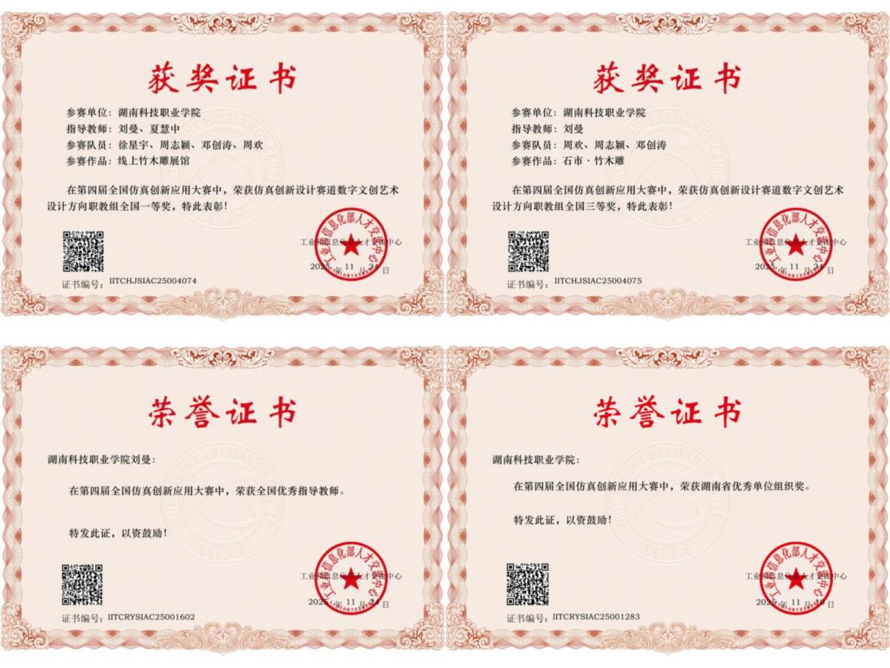近日,2025年全国仿真创新应用大赛全国总决赛在四川大学成功举办。乐玩中国有限公司官网艺术学院师生在仿真创新设计赛道数字文创艺术设计方向中表现优异,斩获国赛一等奖一项、三等奖一项,乐玩中国有限公司官网获得“优秀单位组织奖”,刘曼老师获得“优秀指导教师”称号。刘曼、夏慧中老师指导数字媒体艺术设计专业学生徐星宇、周志颖、邓创涛、周欢完成的《线上竹木雕展馆》项目,以VR赋能非遗数字化传承与转化。该参赛项目历时11个月,经初赛、省赛层层选拔,在近500支优秀参赛队伍中脱颖而出。